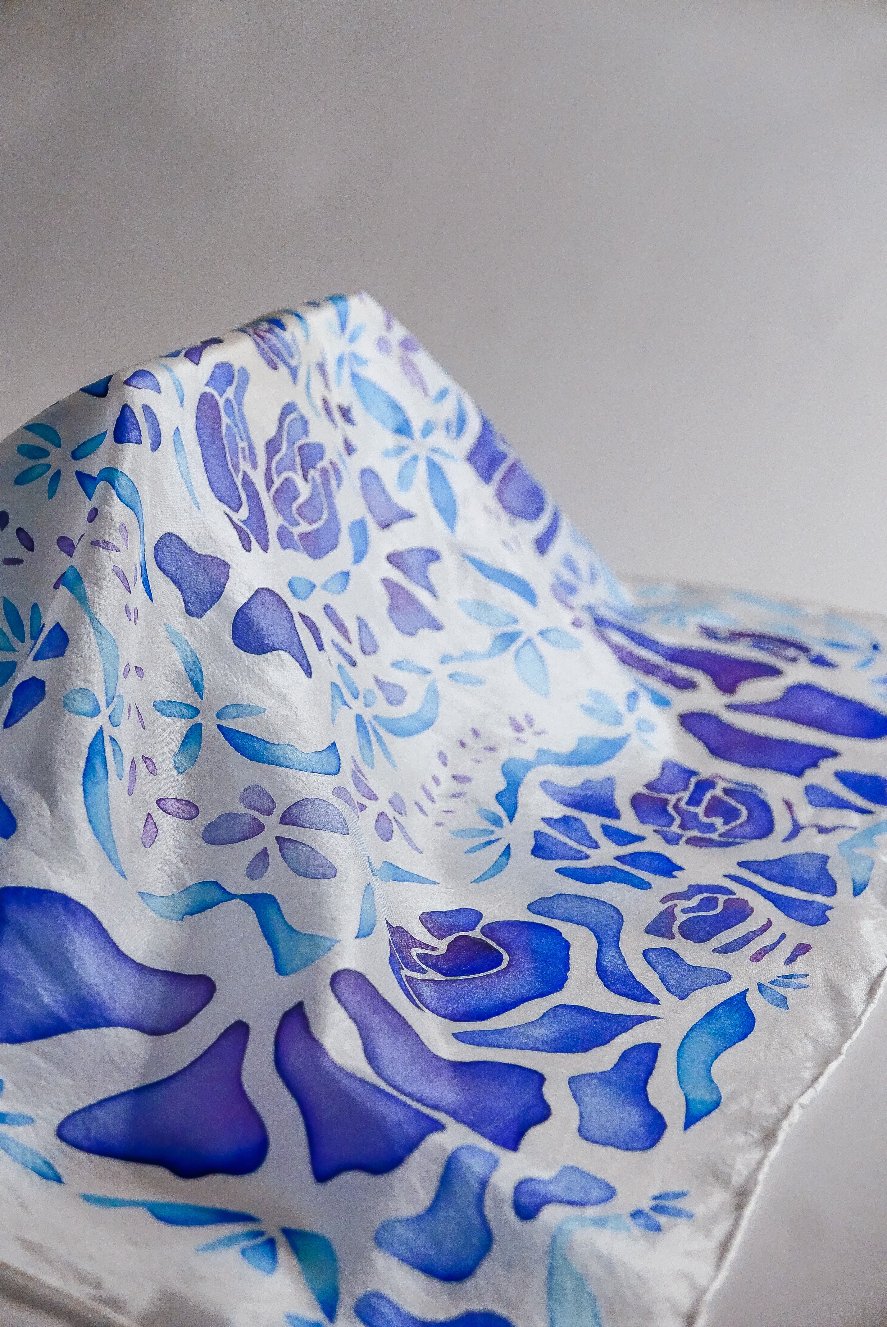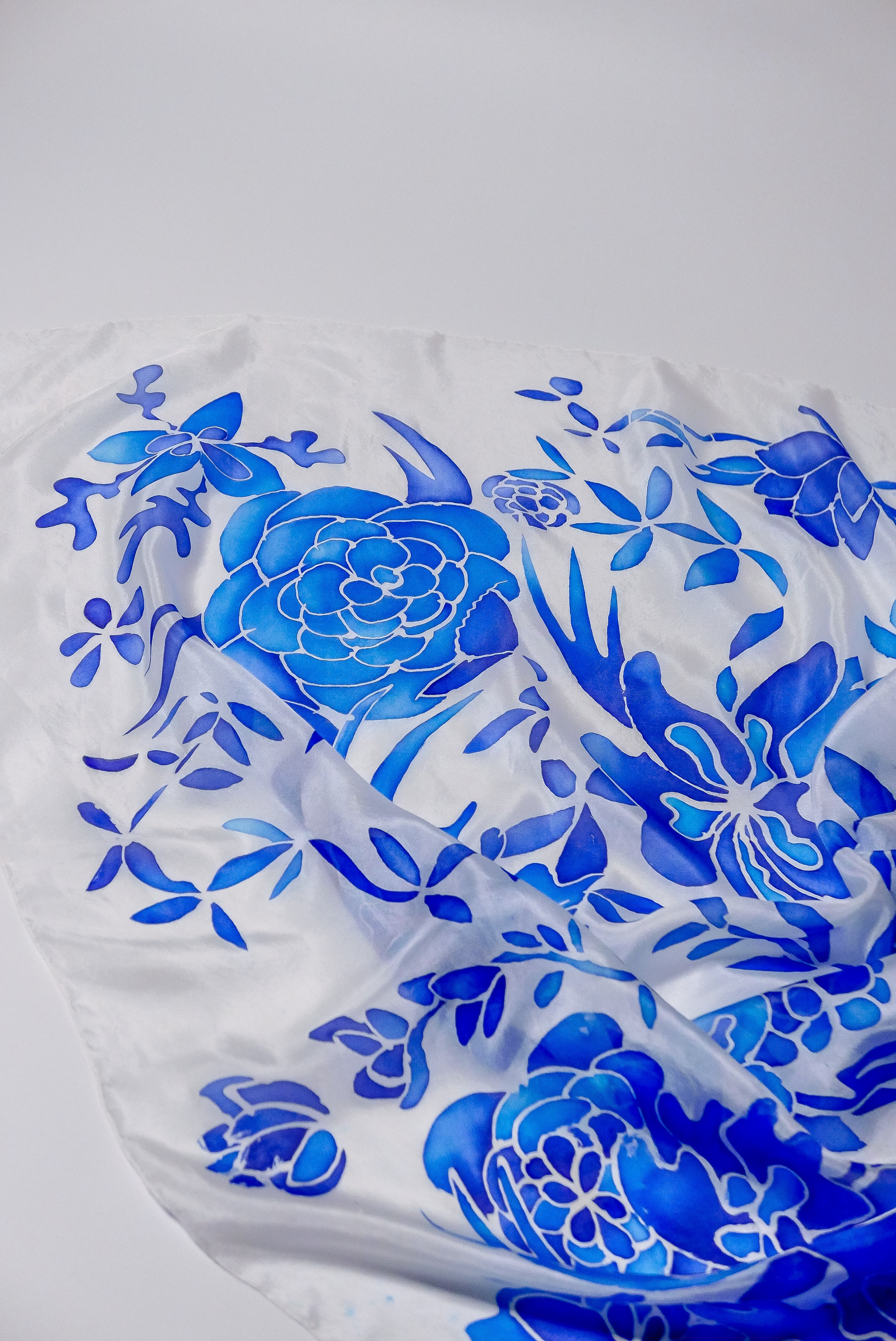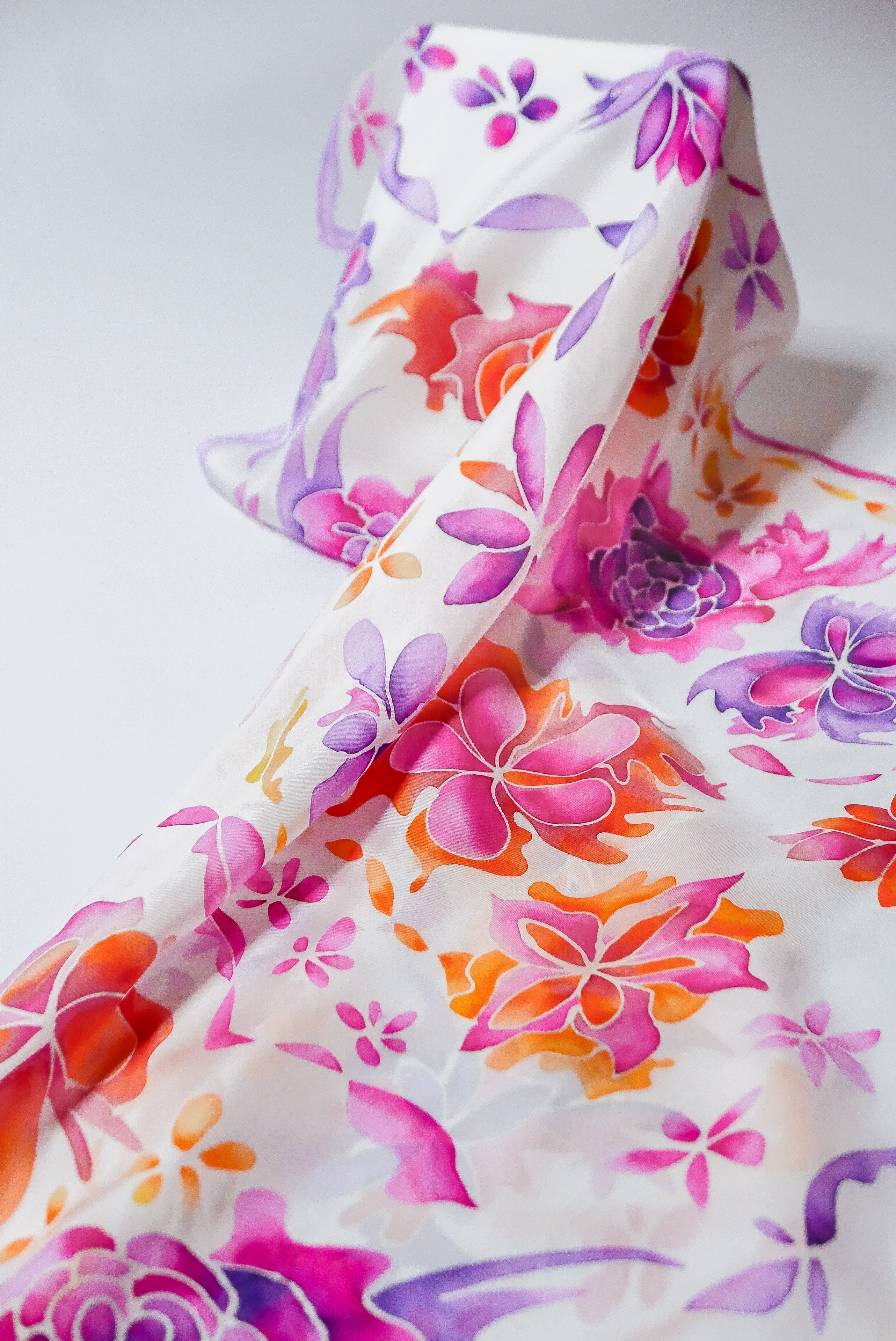 Once painted, the silk is iron-fixed, hand-washed, and finished for a soft drape and lasting richness.