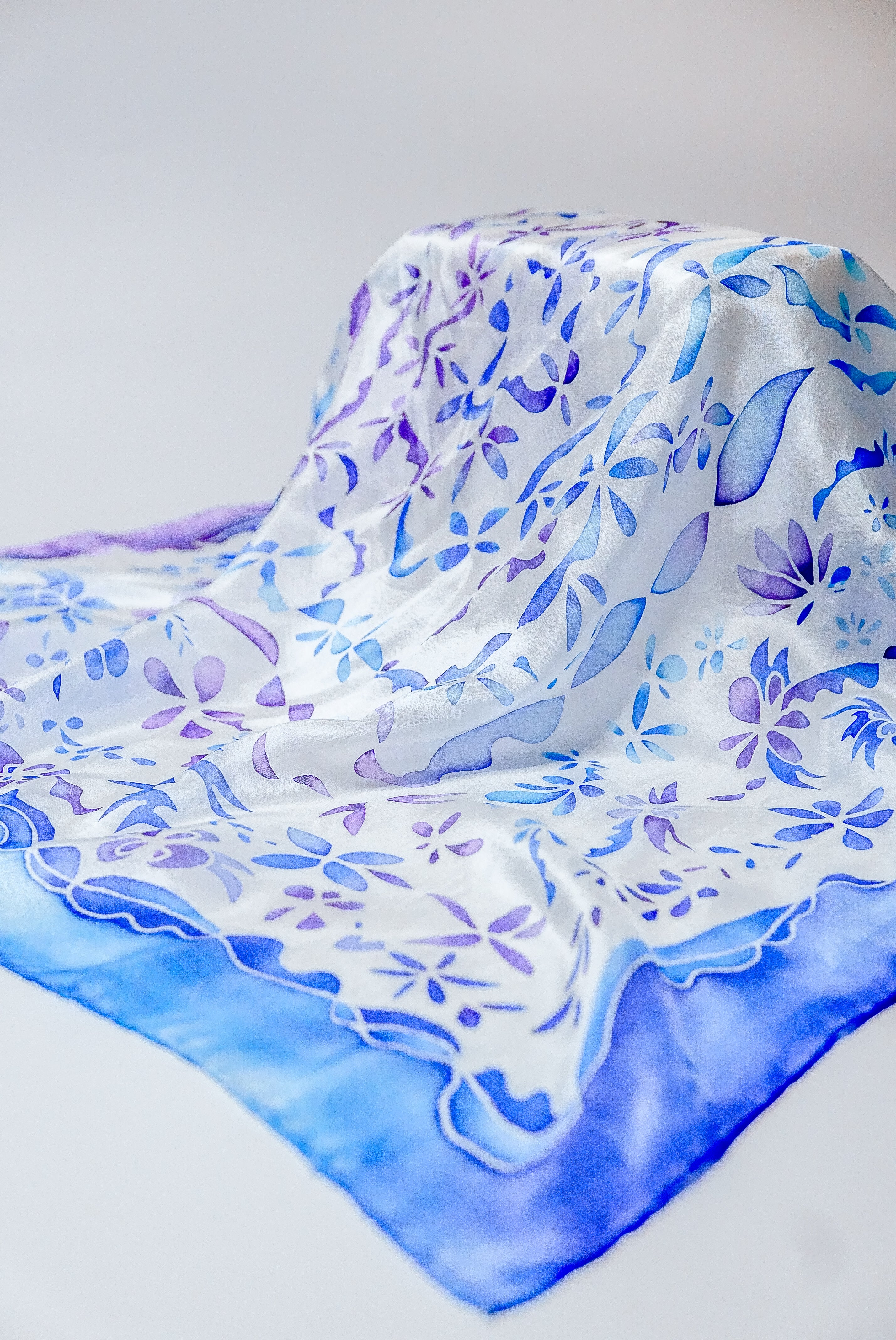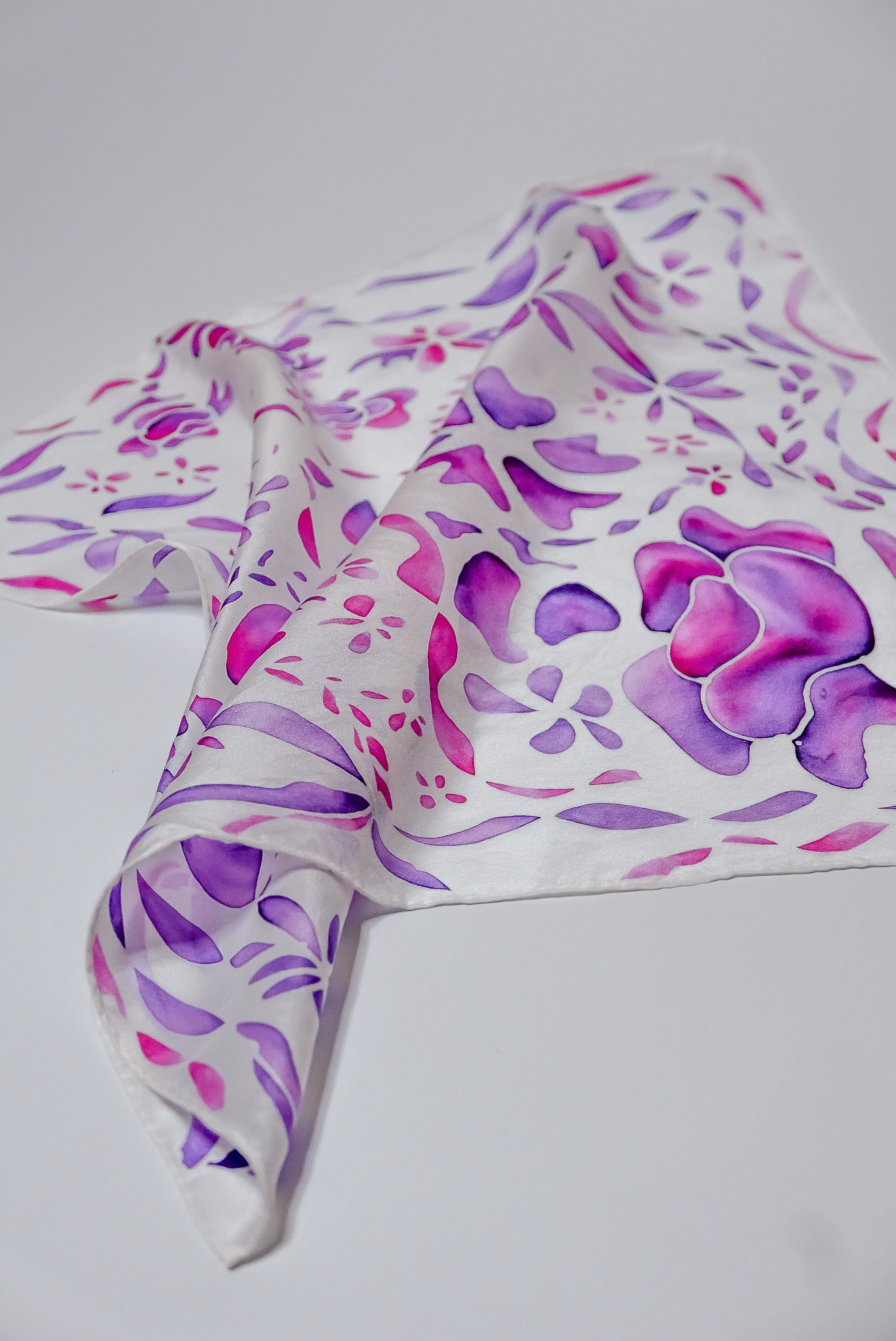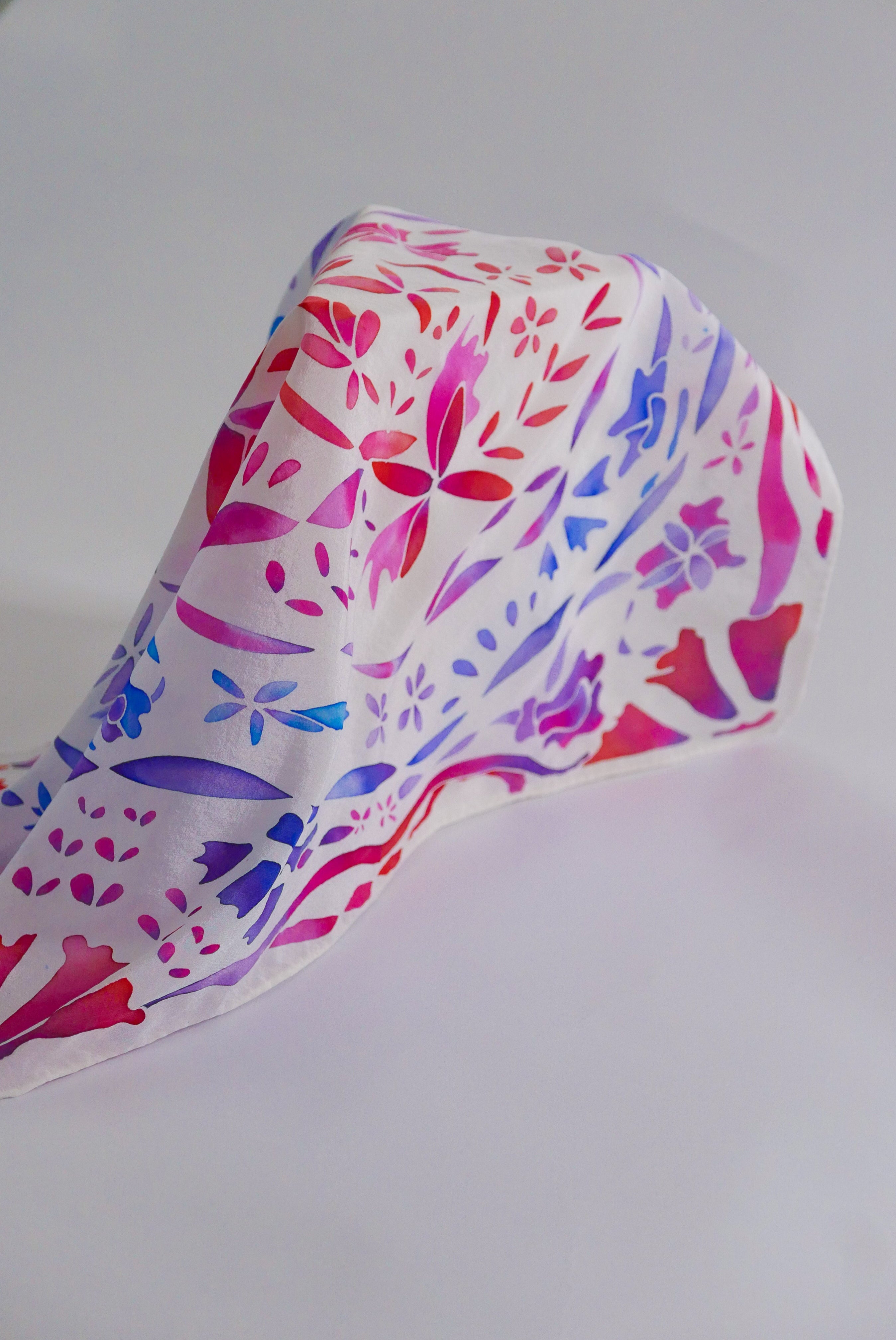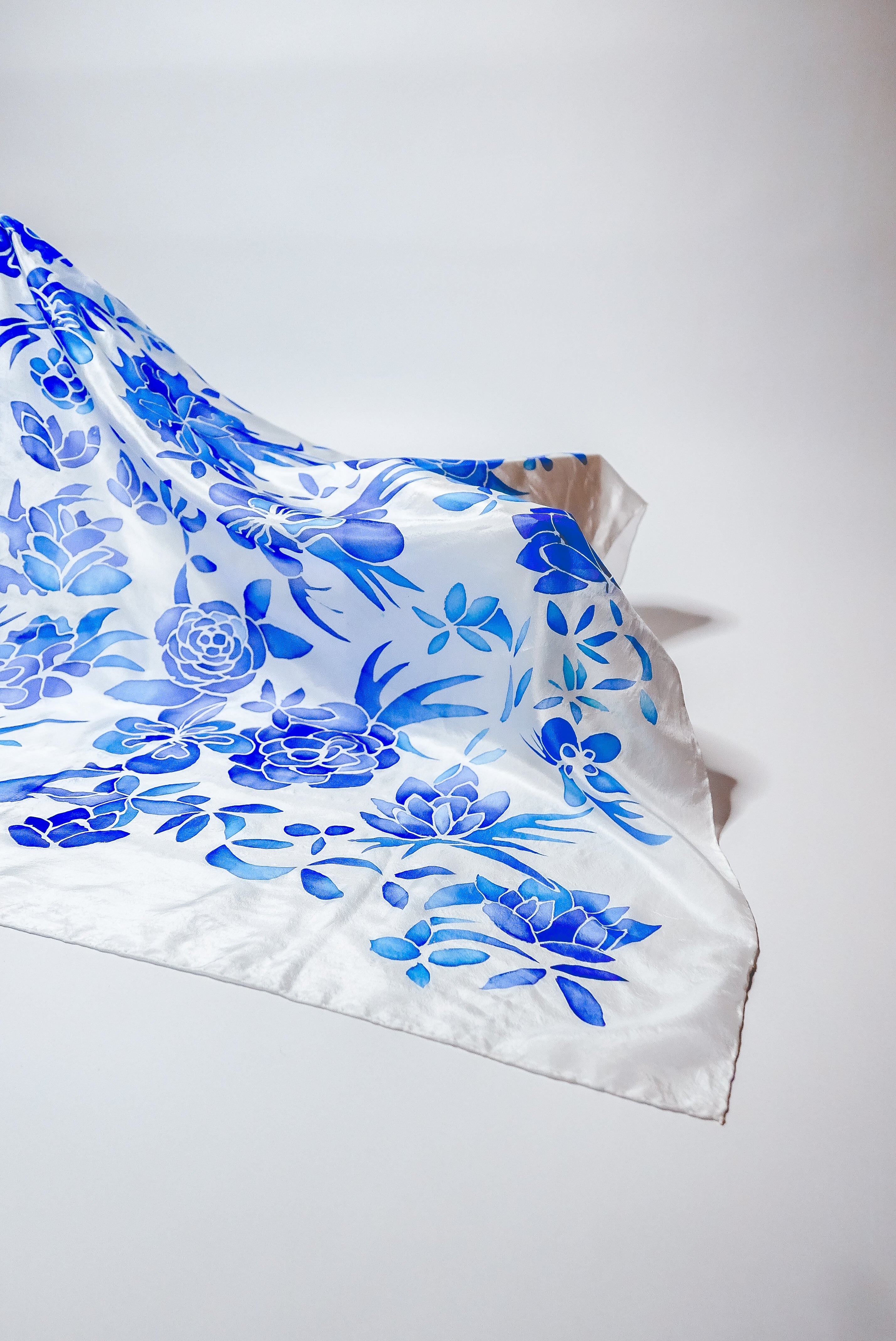 Once painted, the silk is iron-fixed, hand-washed, and finished for a soft drape and lasting richness.