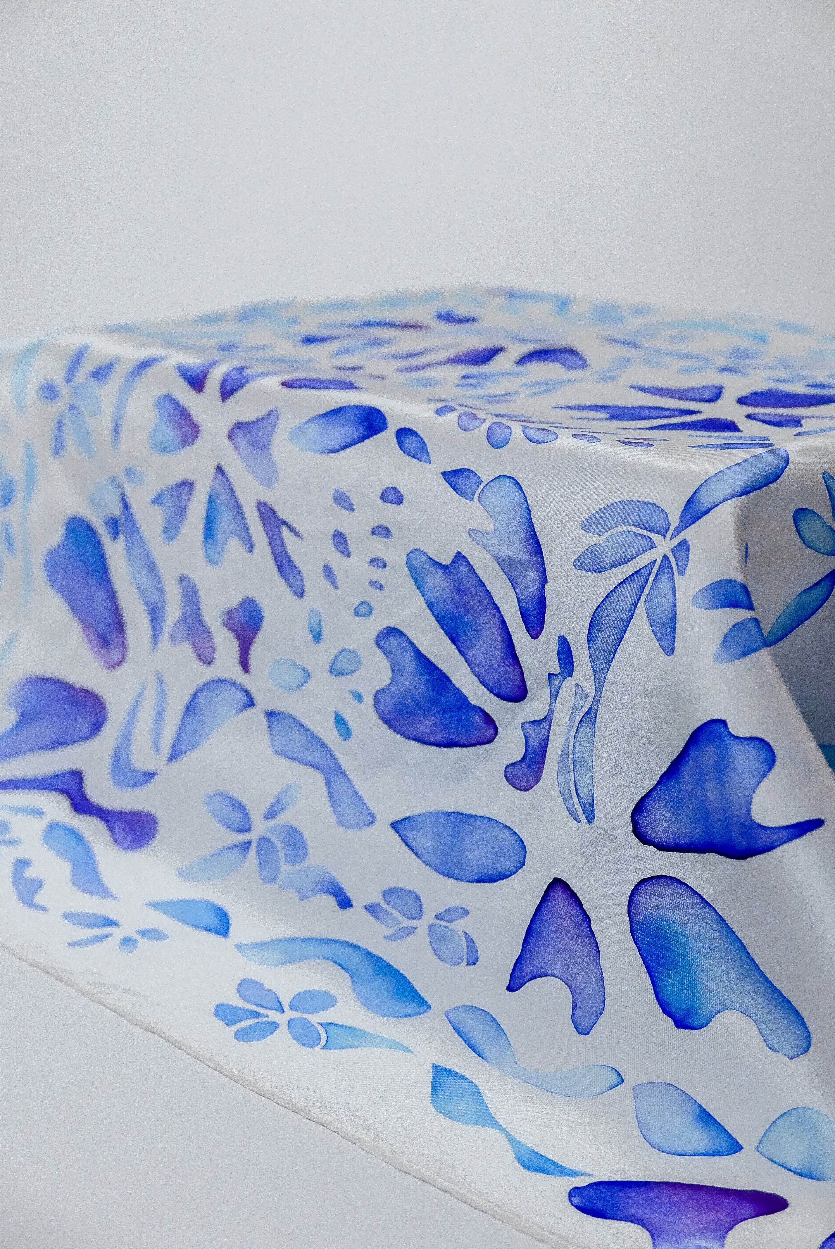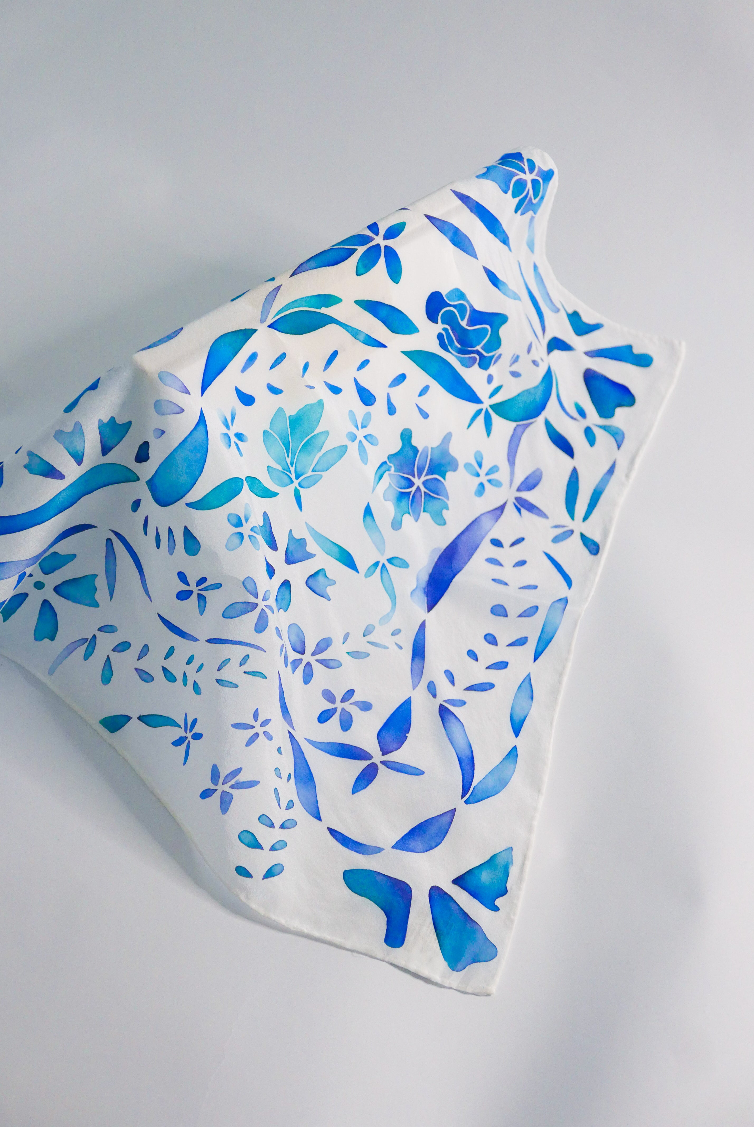 Using water-based silk gutta, paints and intuitive strokes, the process is done slowly and entirely in-studio.